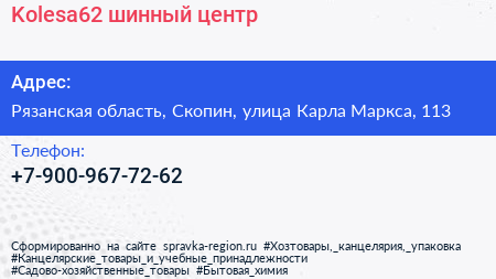 Kolesa62, шинный центр по адресу Рязанская область, Скопин, улица Карла Маркса, 113 в дальнейшем Организация, размещена в следующих категориях: