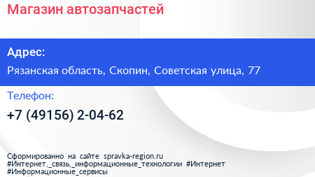 Магазин автозапчастей по адресу Рязанская область, Скопин, Советская улица, 77 в дальнейшем Организация, размещена в следующих категориях: