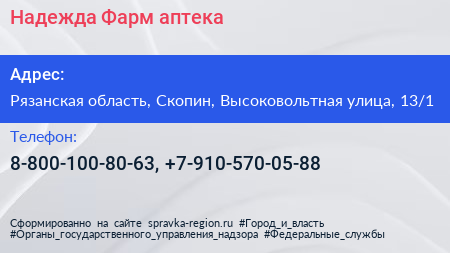 Надежда-Фарм, аптека по адресу Рязанская область, Скопин, Высоковольтная улица, 13/1 в дальнейшем Организация, размещена в следующих категориях: