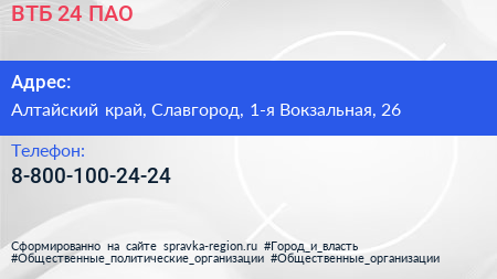 ВТБ 24, ПАО по адресу Алтайский край, Славгород, 1-я Вокзальная, 26 в дальнейшем Организация, размещена в следующих категориях: