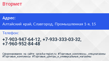 Втормет по адресу Алтайский край, Славгород, Промышленная 1-я, 15 в дальнейшем Организация, размещена в следующих категориях: