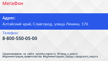 МегаФон по адресу Алтайский край, Славгород, улица Ленина, 176 в дальнейшем Организация, размещена в следующих категориях: