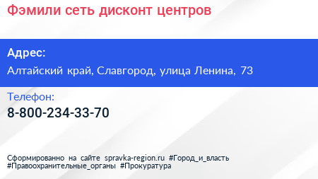 Фэмили, сеть дисконт-центров по адресу Алтайский край, Славгород, улица Ленина, 73 в дальнейшем Организация, размещена в следующих категориях: