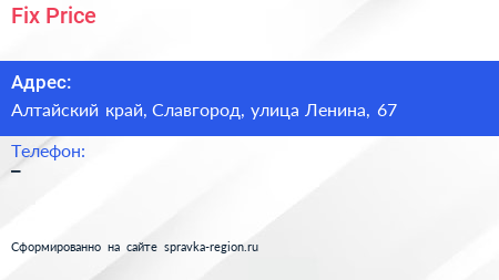 Fix Price по адресу Алтайский край, Славгород, улица Ленина, 67 в дальнейшем Организация, размещена в следующих категориях: