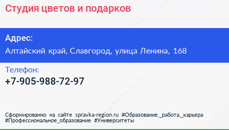 Студия цветов и подарков по адресу Алтайский край, Славгород, улица Ленина, 168 в дальнейшем Организация, размещена в следующих категориях: