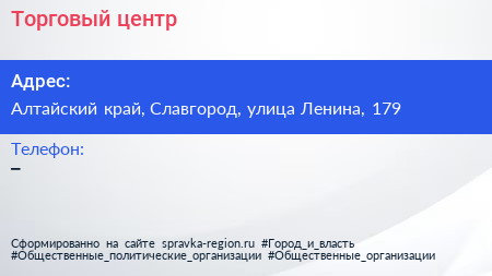 Торговый центр по адресу Алтайский край, Славгород, улица Ленина, 179 в дальнейшем Организация, размещена в следующих категориях: