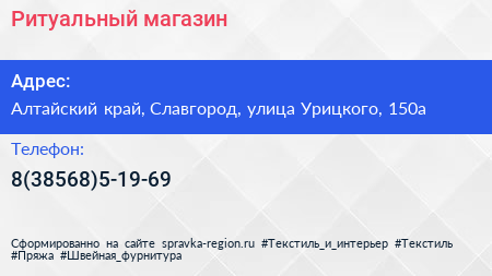 Ритуальный магазин по адресу Алтайский край, Славгород, улица Урицкого, 150а в дальнейшем Организация, размещена в следующих категориях: