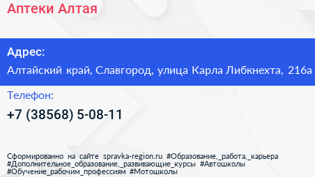Аптеки Алтая по адресу Алтайский край, Славгород, улица Карла Либкнехта, 216а в дальнейшем Организация, размещена в следующих категориях:
