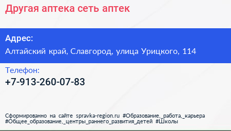 Другая аптека, сеть аптек по адресу Алтайский край, Славгород, улица Урицкого, 114 в дальнейшем Организация, размещена в следующих категориях: