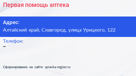 Первая помощь, аптека по адресу Алтайский край, Славгород, улица Урицкого, 122 в дальнейшем Организация, размещена в следующих категориях: