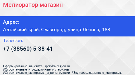 Мелиоратор, магазин по адресу Алтайский край, Славгород, улица Ленина, 188 в дальнейшем Организация, размещена в следующих категориях: