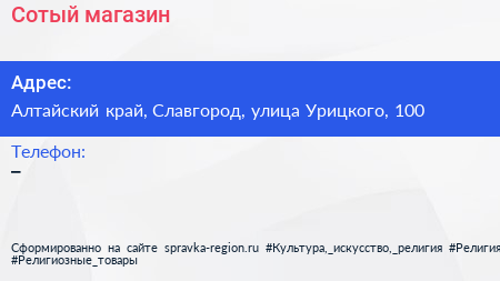 Сотый, магазин по адресу Алтайский край, Славгород, улица Урицкого, 100 в дальнейшем Организация, размещена в следующих категориях:
