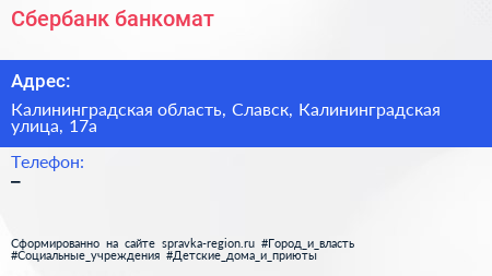 Сбербанк, банкомат по адресу Калининградская область, Славск, Калининградская улица, 17а в дальнейшем Организация, размещена в следующих категориях: