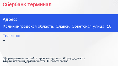 Сбербанк, терминал по адресу Калининградская область, Славск, Советская улица, 18 в дальнейшем Организация, размещена в следующих категориях:
