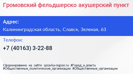 Громовский фельдшерско-акушерский пункт по адресу Калининградская область, Славск, Зеленая, 63 в дальнейшем Организация, размещена в следующих категориях: