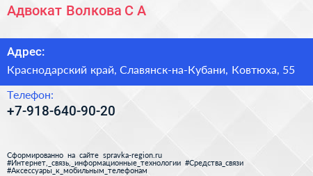 Адвокат Волкова С.А. по адресу Краснодарский край, Славянск-на-Кубани, Ковтюха, 55 в дальнейшем Организация, размещена в следующих категориях: