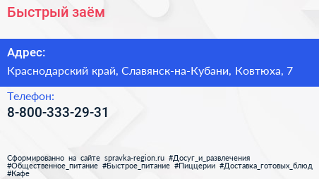 Быстрый заём по адресу Краснодарский край, Славянск-на-Кубани, Ковтюха, 7 в дальнейшем Организация, размещена в следующих категориях: