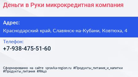 Деньги в Руки, микрокредитная компания по адресу Краснодарский край, Славянск-на-Кубани, Ковтюха, 4 в дальнейшем Организация, размещена в следующих категориях: