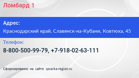 Ломбард №1 по адресу Краснодарский край, Славянск-на-Кубани, Ковтюха, 45 в дальнейшем Организация, размещена в следующих категориях: