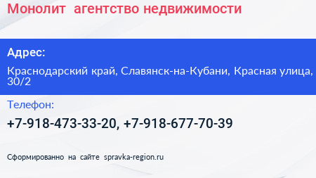 Монолит+, агентство недвижимости по адресу Краснодарский край, Славянск-на-Кубани, Красная улица, 30/2 в дальнейшем Организация, размещена в следующих категориях: