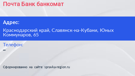 Почта Банк, банкомат по адресу Краснодарский край, Славянск-на-Кубани, Юных Коммунаров, 65 в дальнейшем Организация, размещена в следующих категориях: