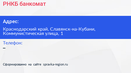 РНКБ, банкомат по адресу Краснодарский край, Славянск-на-Кубани, Коммунистическая улица, 1 в дальнейшем Организация, размещена в следующих категориях: