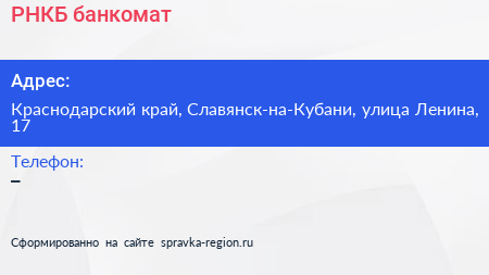 РНКБ, банкомат по адресу Краснодарский край, Славянск-на-Кубани, улица Ленина, 17 в дальнейшем Организация, размещена в следующих категориях: