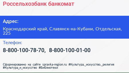 Россельхозбанк, банкомат по адресу Краснодарский край, Славянск-на-Кубани, Отдельская, 225 в дальнейшем Организация, размещена в следующих категориях: