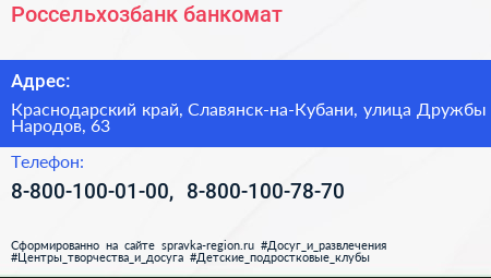 Россельхозбанк, банкомат по адресу Краснодарский край, Славянск-на-Кубани, улица Дружбы Народов, 63 в дальнейшем Организация, размещена в следующих категориях: