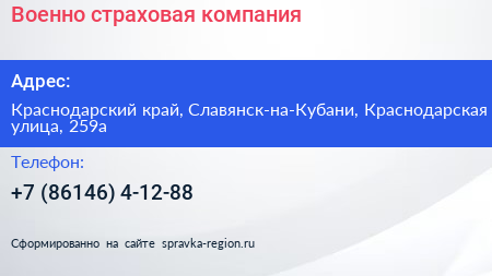 Военно-страховая компания по адресу Краснодарский край, Славянск-на-Кубани, Краснодарская улица, 259а в дальнейшем Организация, размещена в следующих категориях: