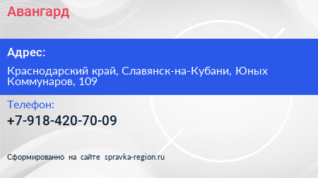 Авангард по адресу Краснодарский край, Славянск-на-Кубани, Юных Коммунаров, 109 в дальнейшем Организация, размещена в следующих категориях: