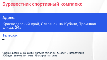 Буревестник, спортивный комплекс по адресу Краснодарский край, Славянск-на-Кубани, Троицкая улица, 245 в дальнейшем Организация, размещена в следующих категориях: