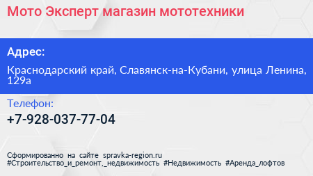 Мото-Эксперт, магазин мототехники по адресу Краснодарский край, Славянск-на-Кубани, улица Ленина, 129а в дальнейшем Организация, размещена в следующих категориях: