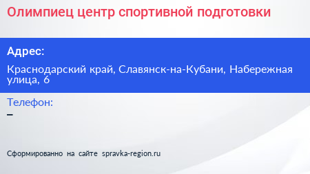 Олимпиец, центр спортивной подготовки по адресу Краснодарский край, Славянск-на-Кубани, Набережная улица, 6 в дальнейшем Организация, размещена в следующих категориях:
