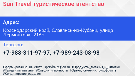 Sun Travel, туристическое агентство по адресу Краснодарский край, Славянск-на-Кубани, улица Лермонтова, 216Б в дальнейшем Организация, размещена в следующих категориях: