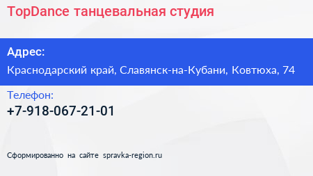 TopDance, танцевальная студия по адресу Краснодарский край, Славянск-на-Кубани, Ковтюха, 74 в дальнейшем Организация, размещена в следующих категориях: