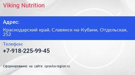 Viking Nutrition по адресу Краснодарский край, Славянск-на-Кубани, Отдельская, 252 в дальнейшем Организация, размещена в следующих категориях: