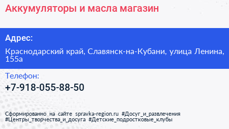 Аккумуляторы и масла, магазин по адресу Краснодарский край, Славянск-на-Кубани, улица Ленина, 155а в дальнейшем Организация, размещена в следующих категориях: