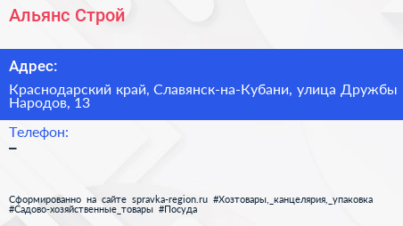 Альянс-Строй по адресу Краснодарский край, Славянск-на-Кубани, улица Дружбы Народов, 13 в дальнейшем Организация, размещена в следующих категориях: