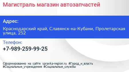 Магистраль, магазин автозапчастей по адресу Краснодарский край, Славянск-на-Кубани, Пролетарская улица, 252 в дальнейшем Организация, размещена в следующих категориях: