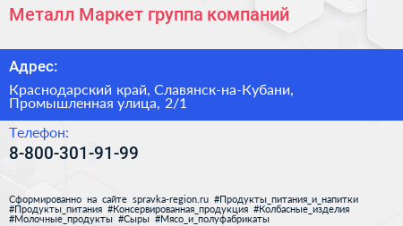 Металл-Маркет, группа компаний по адресу Краснодарский край, Славянск-на-Кубани, Промышленная улица, 2/1 в дальнейшем Организация, размещена в следующих категориях: