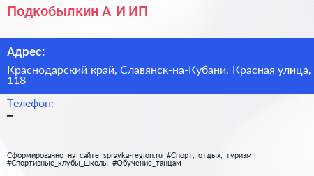 Подкобылкин А. И., ИП по адресу Краснодарский край, Славянск-на-Кубани, Красная улица, 118 в дальнейшем Организация, размещена в следующих категориях: