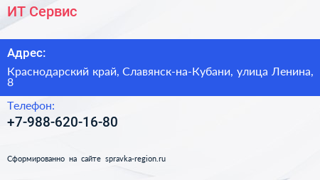 ИТ Сервис по адресу Краснодарский край, Славянск-на-Кубани, улица Ленина, 8 в дальнейшем Организация, размещена в следующих категориях: