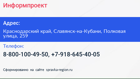 Информпроект по адресу Краснодарский край, Славянск-на-Кубани, Полковая улица, 259 в дальнейшем Организация, размещена в следующих категориях: