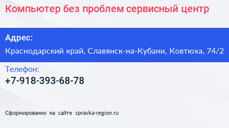 Компьютер без проблем, сервисный центр по адресу Краснодарский край, Славянск-на-Кубани, Ковтюха, 74/2 в дальнейшем Организация, размещена в следующих категориях: