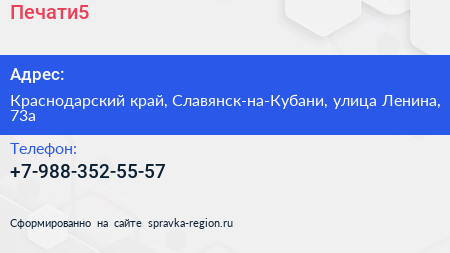 Печати5 по адресу Краснодарский край, Славянск-на-Кубани, улица Ленина, 73а в дальнейшем Организация, размещена в следующих категориях: