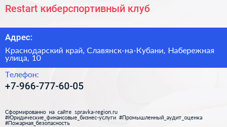 Restart, киберспортивный клуб по адресу Краснодарский край, Славянск-на-Кубани, Набережная улица, 10 в дальнейшем Организация, размещена в следующих категориях:
