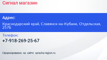 Сигнал, магазин по адресу Краснодарский край, Славянск-на-Кубани, Отдельская, 257Б в дальнейшем Организация, размещена в следующих категориях:
