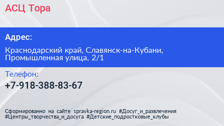 АСЦ Тора по адресу Краснодарский край, Славянск-на-Кубани, Промышленная улица, 2/1 в дальнейшем Организация, размещена в следующих категориях: