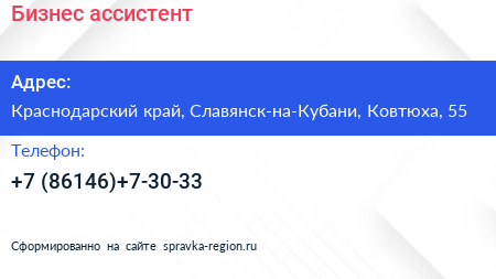 Бизнес ассистент по адресу Краснодарский край, Славянск-на-Кубани, Ковтюха, 55 в дальнейшем Организация, размещена в следующих категориях: